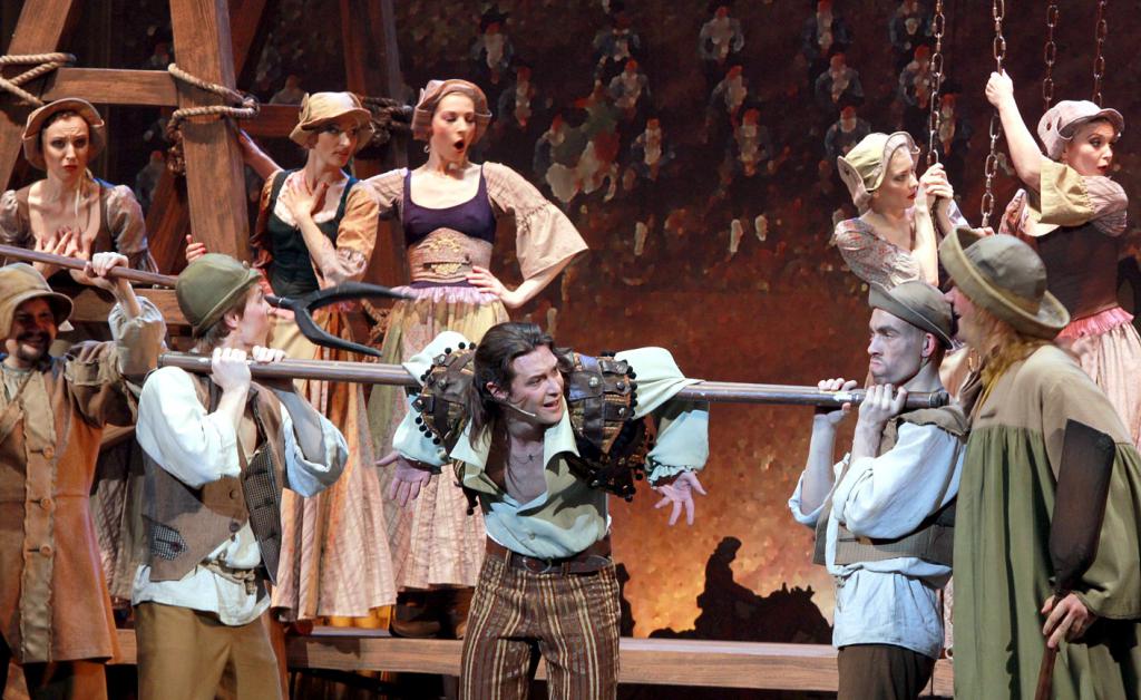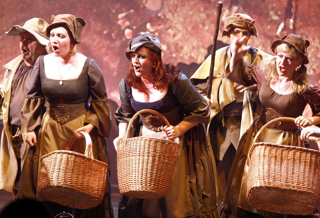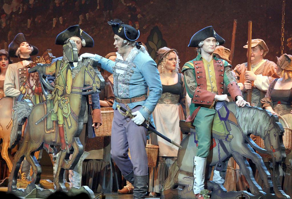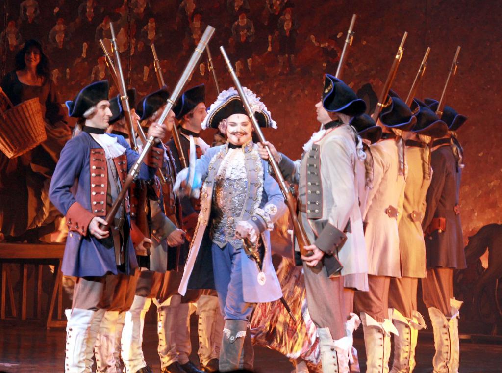 Что было скромнее? Оформление сцены и, увы, часть вокалистов. На сцене - бюджетный минимум: два сооружения, больше всего напоминающие гильотины, три дощатых «туалета типа сортир», ну и реквизит по мелочи - деревянные лошадки, картонные солдатики, корзины, флажки и шпаги.