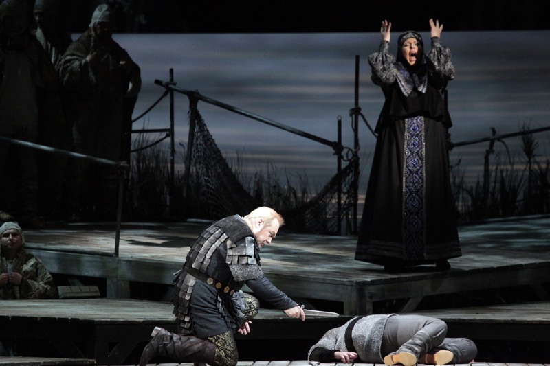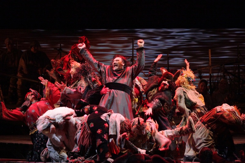 То, что предложили в качестве видеоряда к опере режиссёр Александр Титель и художник Валерий Левенталь, не вызывает ни резкого негатива, ни пламенного восторга. Собственно, этим оно и плохо. Да, добротно. Образ реки сделан просто чудесно. Её гладь то весело рябится, то величаво переливается, то трагически застывает и обращается в омут. Всё красиво. Но вместе с тем очень уж монотонно. Световая палитра, созданная Дамиром Исмагиловым, поддерживает общую цветовую гамму, состоящую из чёрного, оранжевого, красного, синего, фиолетового, коричневого, жёлтого и стального с серым. Определенно не хватает зелени, отчего вся цветовая партитура выглядит у Левенталя подражанием Левитану: сплошная «золотая осень», в финале отчетливо разрешающаяся неожиданной снежной пургой, никак не стыкующейся с либретто, но в данном случае абсолютно уместной. Честно говоря, из всего оформления мне больше всего понравилось именно четвертое действие, несмотря на самое большое количество в нем собственно режиссёрских мизансценных недоработок.