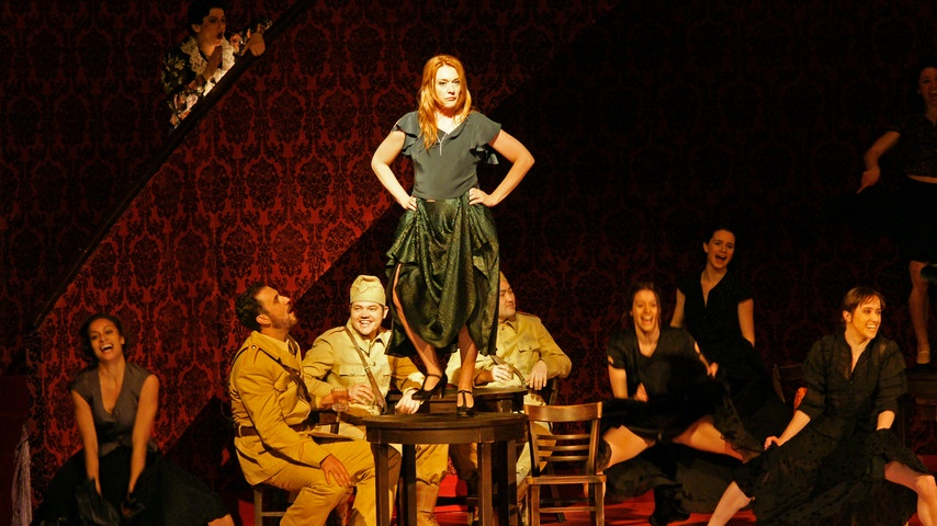 Её власть не только в сексуальности: волевая походка, отточенность жестов, полное отсутствие рефлексии подчёркивают её лидерские качества. Она здесь главная, и легко догадаться, что укрощение такой женщины становится спортивным развлечением обитателей фабрики, которая в мрачных округлых декорациях Мириам Бютер больше походит на закрытое предприятие строгого режима. Кармен в постановке Алетты Коллинз подчёркнуто лишена эмпатии, она — средообразующая единица, которая подчиняет и направляет, контролируя всё, кроме собственных эмоций. Видимо, поэтому этот образ органично вписывается как в сюжет, так и в музыку, ведь традиционная Кармен так же полностью растворена в собственном эгоизме.