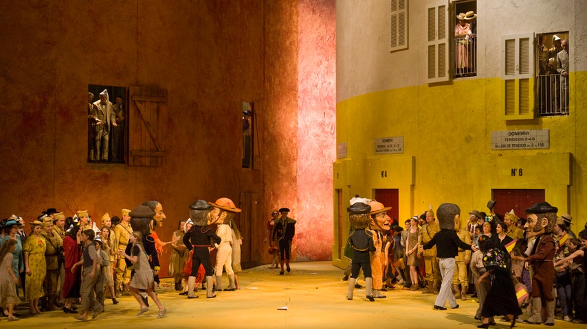 Одной из самых постановочно сложных сцен «Кармен» был, есть и будет проход тореодоров в четвертой картине: по сюжету там и кони, и люди, и торговцы, и зрители, — словом, животно-народные массы. У Коллинз знаменитая сцена начинается с очереди у окошка кассы арены, на которой будет проходить коррида. Пока народу не было, на кассе висела табличка «открыто». Но как только на горизонте появляется первый покупатель, кассир сразу прикрывает лавочку, со сладострастной невозмутимостью наблюдая как на жаре выстраивается длиннющая очередь. В целом — сатирично. Но слишком уж «не в кассу». Сам же проход кабальеро выглядит слабо считываемой пародией то ли на политических деятелей, то ли на знаменитых исполнителей партий Эскамильо, во всяком случае, в гигантских головах-масках, одетых на статистов, неуверенно пробирающихся с таким грузом ответственности на плечах по неширокому подиуму между оркестром и залом, можно было при желании усмотреть черты и тех, и других, но сам этот символический перегруз выглядел откровенным перебором.
