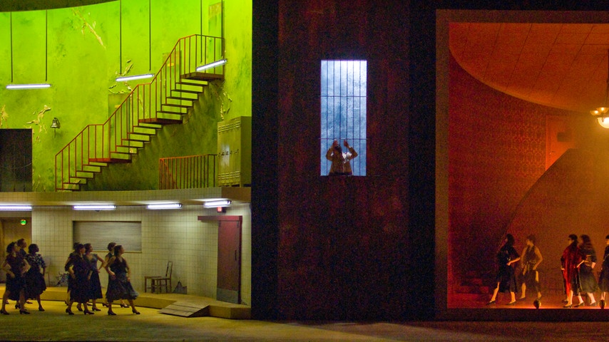 Справедливости ради нужно заметить, что если бы режиссёр ограничила свою постановочную активность лишь одной инсценировкой финального дуэта Хозе и Кармен, то уже за одну эту работу спектакль можно было бы признать удачным, ибо более напряженного выяснения отношений я не встречал не только в театре, но и в жизни. Однако, даже сторонников такой экстремальной выразительности психологических зарисовок устроило мрачновато оформление спектакля, предложенное Мириам Бютер: облупленные зеленоватые фабричные стены с вкраплениями кафельных инсталляций в первой картине резко контрастировали с кричаще алым бордельным декором сцены у Пастьи, а андеграудно-канализационная эстетика третьей картины вступала в мистическую оппозицию с солнечной терракотово-коралловой гаммой финальной сцены. Костюмы в исполнении художницы Габриэль Дальтон выглядели на редкость гармонично в рамках общей концепции. Но, разумеется, это всё не уберегло спектакль от недовольства фестивальной аудитории: постановочную группу начали освистывать уже после первого действия, а после выхода на поклоны неистовые «бу!» звучали уже просто неприлично.