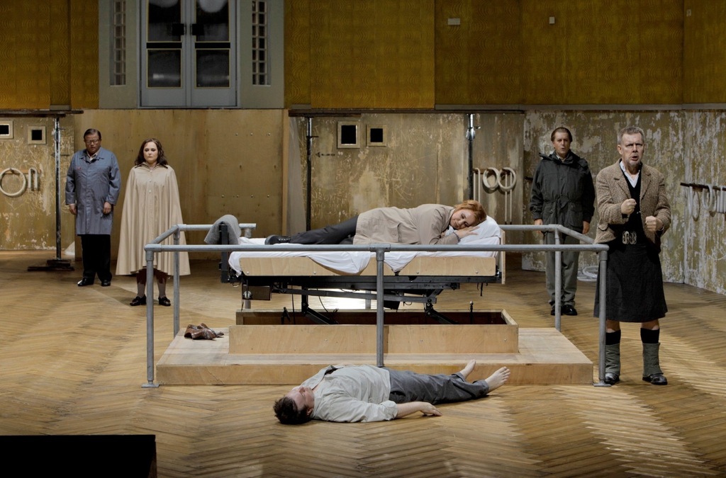 И это даже на фоне того, что подача звука певицей отличалась явной расфокусированностью: то широко, то слишком зауженно. И хотя все верхние кульминации прозвучали с некоторой форсировкой, общее впечатление от вокала певицы осталось превосходное. И несколько странное, будто на выдохе, будто из загробья исполнение «Mild und Leide» воспринималось художественно продуманным и логичным. Ведь в спектакле Марталера Изольда умирает вместе с Тристаном: на сцене в третьем акте мы видим уже постно надэмоциональный силуэт женщины в бесформенном и почти бесцветном пальто, которая не бросается к трупу возлюбленного и не рвет на себе волосы от горя. Она, лишившись эмоций после смерти возлюбленного, просто укладывается на его опустевшую больничную кровать и угасает, самоустраняясь от бессмысленного существования, в котором нет места её чувству, в котором само её чувство — бессмысленно в своей беспросветной бесперспективности.