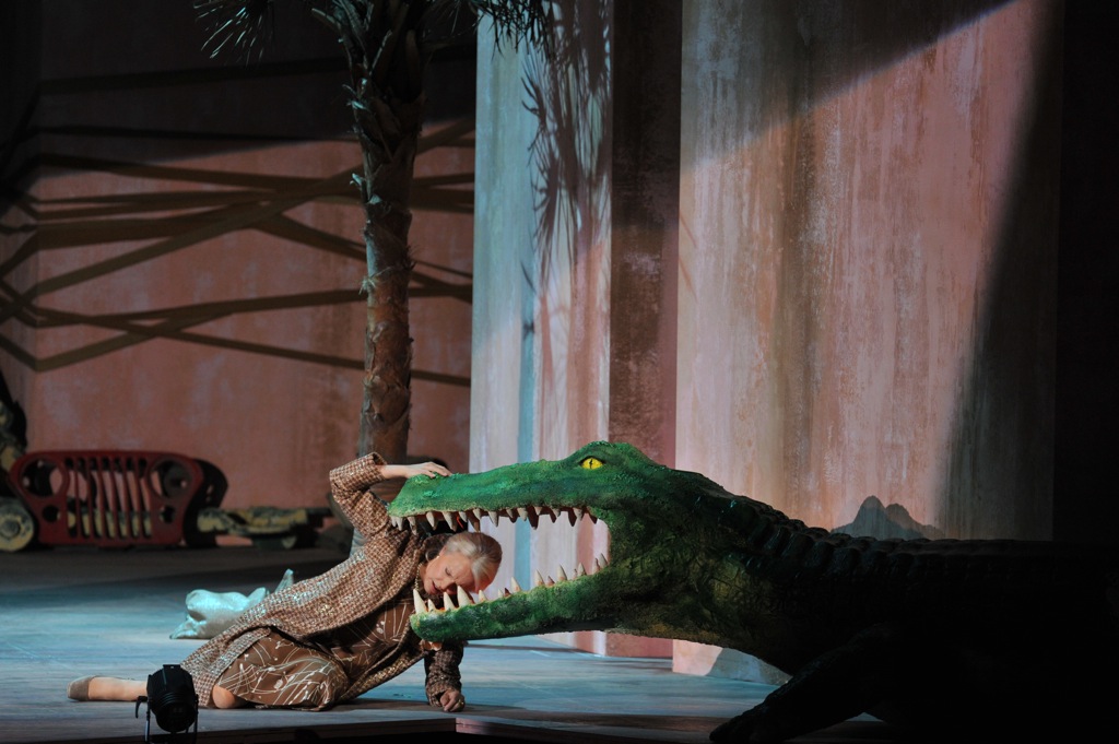 Ближний Восток, Египет, сотрясаемый волнами революций, горящие нефтяные вышки — на горизонте, штурмовики с автоматами наперевес — на первом плане. Наискось пересекая зеркало сцены, летают и взрываются ракеты, в углу стоит зенитка, в другом — перевернутый грузовик, с отлетевшим колесом и пулеметом. Разверзая зубастую пасть прямо в зал, мирно пасется чучело крокодила, которому отведена сугубо важная роль: в пасть будут, поочередно, засовывать головы Корнелия (Анна-Софи фон Оттер) — неутешная вдовица, в пароксизме отчаяния; и сама Чечилия Бартоли — Клеопатра, грубо понуждаемая к этому собственным братцем, Птолемеем. Между этими двумя событиями разрезвившаяся девочка-Клеопатра зашвырнет туда скомканную куртку ненавистного брата-мужа, так что, символически, и он побывает в крокодильей пасти.