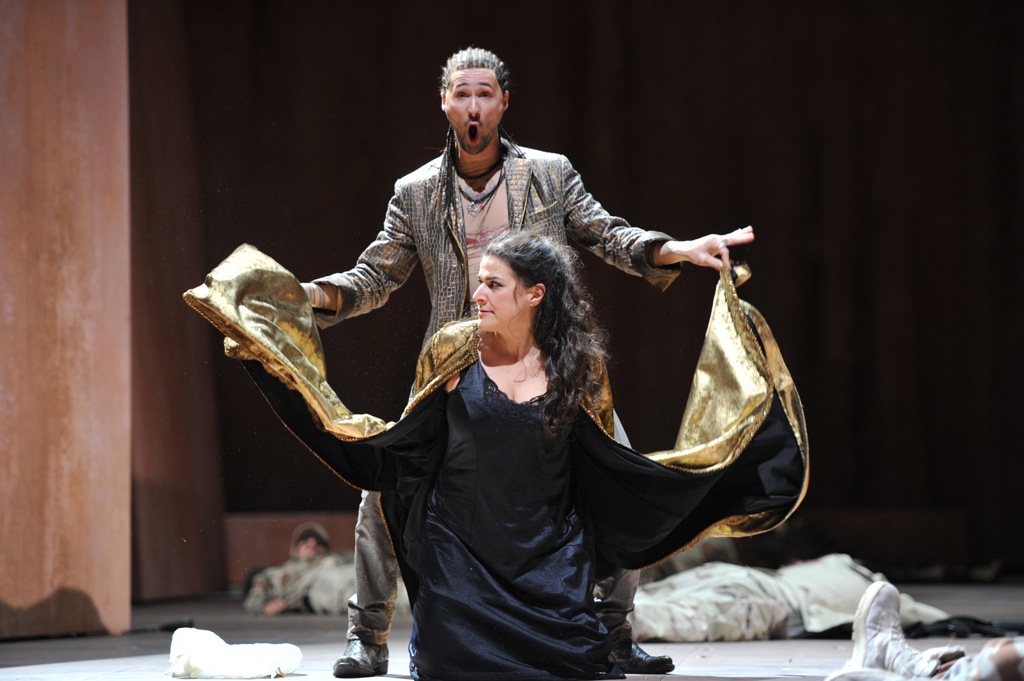 Навязшая в зубах «актуализация», настойчивые попытки приблизить оперу к событиям наших дней, «документализировать» спектакль, привлекая к этому кадры насилия, почерпнутые из новостных сюжетов — дело не новое, но почтенное. Космических высот в нем достиг в свое время Барри Коски, выведя в глюковой «Ифигении в Авлиде» сцены пыток и издевательств над арабскими заключенными американских солдат в Ираке, снимки которых облетели весь мир и вызвали беспрецедентный резонанс. Моше Ляйзеру и Патрису Корье — постановщикам «Юлия Цезаря» — до Коски, конечно, далеко. Но сцены, в которой Птолемей весьма натуралистично предается мастурбации, глядя на порнокалендарь, или где он насилует собственную сестру, связав ей руки и надев на голову авоську с ручками, безусловно, запоминаются.