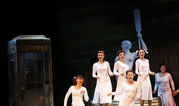 Стёба, который придирчивый зритель мог бы трактовать как «антисоветский», в спектакле в общем-то тоже нет, хотя и уводящие героев под руку комитетчики в плащах, и бесноватый парторг на сцене имеются.