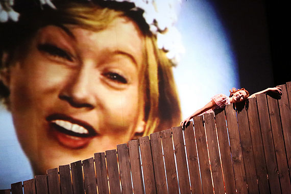 Оформление сцены — предельно простое, центральная линия — уходящий в небо деревянный забор, это как бы визуальная основа. На него (при помощи видеопроекций, открывающихся окон, дверей и дополнительных «аутентичных» лавочек, будочек, девушек с веслом и прочих грамотно подобранных предметов реквизита, а также за счет перестроений артистов хора и миманса) накладываются уже самые разные образы — историческая фото- и кинохроника, московские памятники архитектуры и индустриальный пейзаж, городской парк, порт, парад физкультурников или даже сюрреалистическая цитата геликоновского спектакля «Мазепа» с плывущими виллисами… В общем, любой кадр-трансформация, раз уж решено спеть не просто «видеоклип», а целое «кино».