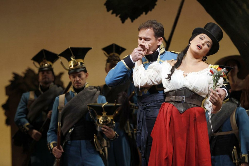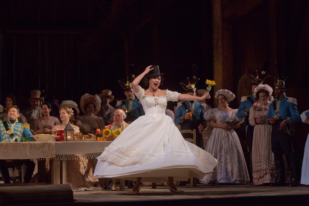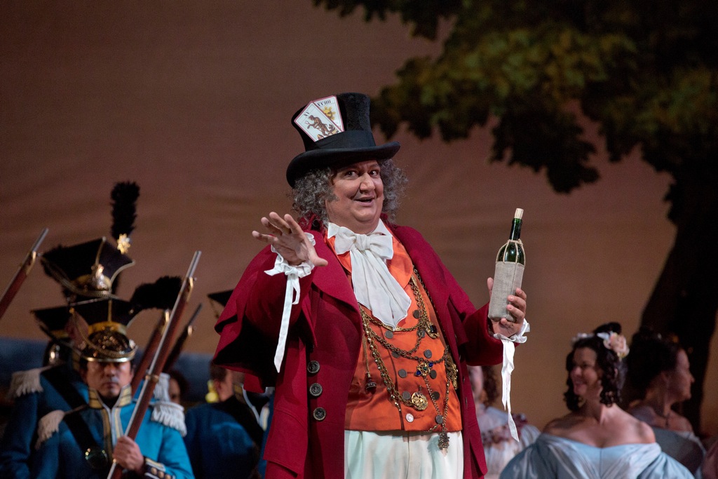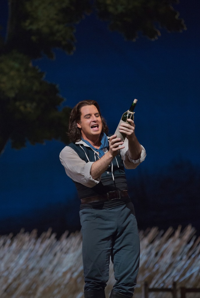 Для крестьянского простака Неморино (поистине фантастическая актерская и вокальная работа Мэтью Поленцани!) его любовь к Адине — это просто уже вопрос жизни и смерти! Даже не верится, что это тот же самый исполнитель, с весьма большими усилиями пытавшийся «вписаться» в партию Альфреда в вердиевской «Травиате» на последней прямой трансляции из «Met» прошлого сезона. Партия Альфреда, вообще, очень коварна в вокально-стилистическом отношении, и надо быть просто большим перфекционистом, чтобы действительно исполнить ее так, чтобы зрителю от этого не было «мучительно больно». Похоже, этот образ Верди, лирический по своему внешнему лоску, но весьма и весьма драматический по внутреннему содержанию, явно находится вне амплуа этого певца, однако простые и незатейливые душевные излияния Неморино настолько идеально ложатся на голос исполнителя, что и в тесситурном плане никаких проблем на этот раз у него не наблюдается. Мэтью Поленцани вкладывает в «золотые ноты» своей партии столько души, столько самой настоящей боли и муки буквально со слезами на глазах, столько искреннего и правдивого чувства, оставаясь при этом в стихии всепоглощающего бельканто, что в обсуждаемой постановке этот образ в паре потенциальных персонажей-любовников — да не убьют меня поклонники Анны Нетребко! — явно выступает на первый план.