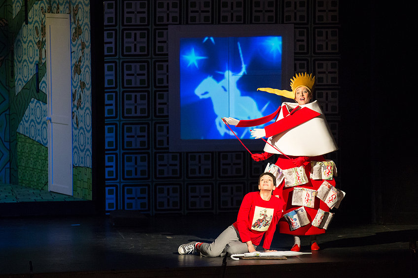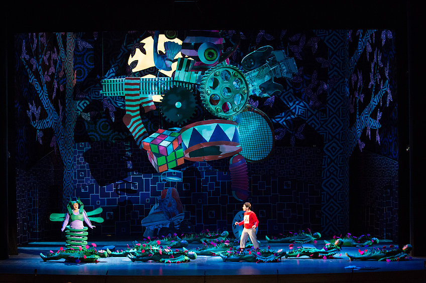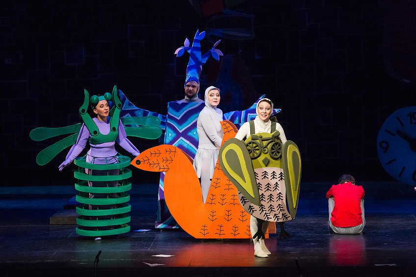 Сказку для детей незачем перегружать всеми этим декадентскими аллюзиями, отыскивать конфликт и динамику, обыгрывать контраст между абсурдно-комическими сценками и пронзительной, совсем не детской сценой с появлением Принцессы. Достаточно будет эстетики детской книжки-раскладушки, вполне милых, хоть и неуклюжих костюмов-трансформеров (Мария Чернышёва), и ярких видеоинсталляций, чтобы мелькало, как в мультиках, дети это любят. Ну и чтобы все трогательно топтались на сцене кто во что горазд, без всякого балета, зато как на утреннике в детском саду. И бог с ними, с неудавшимися колоратурами, с качающимися голосами вместо прозрачного легкого «французского» тембра, не беда.