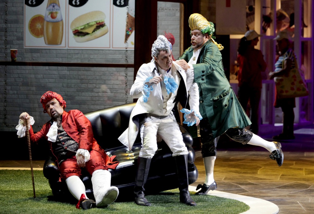 Но при этом музыка Россини оказалась напрочь «задавленной», а спектакль — лишенным изысканной театральной зрелищности. В силу этого имена ничем не поразивших исполнителей любовного дуэта упомяну лишь для протокола: София – Мария Алейда, Флорвиль – Давид Алегрет. При этом с гораздо большим энтузиазмом хочется назвать тройку сюжетно важных для этого фарса персонажей buffo: баритона Андреа Винченцо Бонсиньоре (Филиберто), а также двух басов – Карло Лепоре (Гауденцио) и, наконец, Роберто Де Кандиа (Брускино-отца).