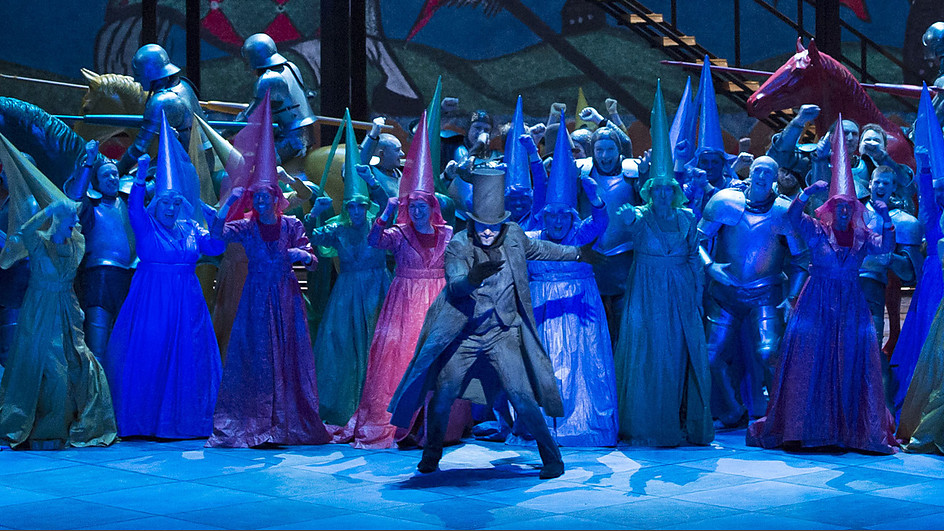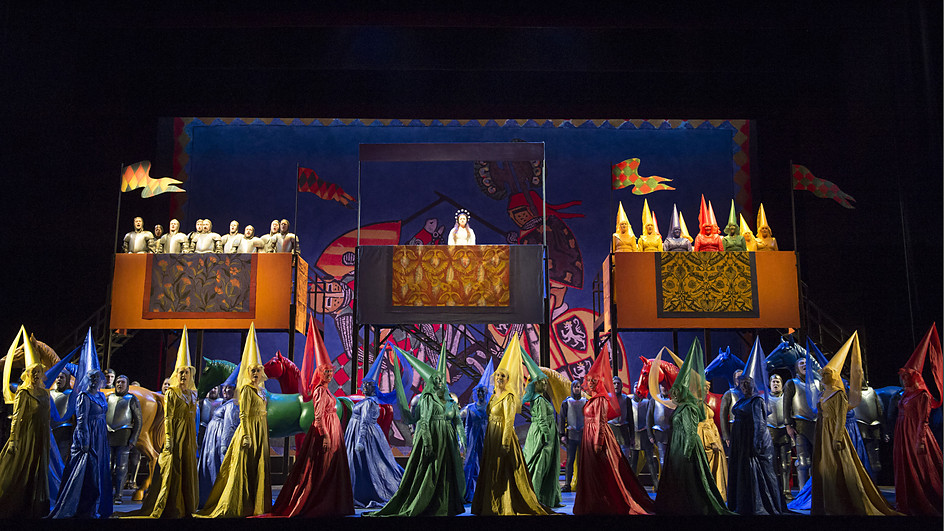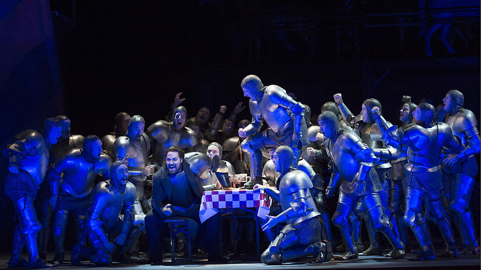 Постановщик Лоран Пелли продумал каждую деталь, отталкиваясь в своих акцентах от музыки, что заставляет только сказать: «Браво!». Особенно интересен подход к решению массовых сцен. Отношение к рыцарской тематике проходит сквозь призму военной машинерии. Мужской хор, одетый в рыцарские латы, решён режиссёром как некая военная фигура, машина — символ насилия и убийств. Сразу пришла на ум в качестве основы всего этого терракотовая армия китайского императора Цинь Шихуанди. На спектакле возникнет тоже самое чувство, что это пришло оттуда, из далёких веков, но не из Китая, где даже лошади — игрушки, переставляемые властной рукой кого-то, пока неясного.