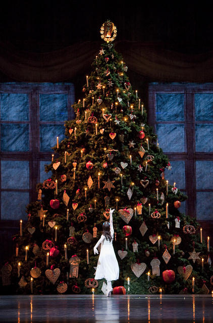 Великолепные декорации, имитирующие роскошную гостиную с нарядно украшенной елкой на заднем плане, милое семейство, готовящееся к торжеству, уютный, домашний, земной рождественский вечер (художница Юлия Тревельян Оман). Но вот завершается празднество, расходятся гости, и чудеса одно за другим сменяют друг друга.