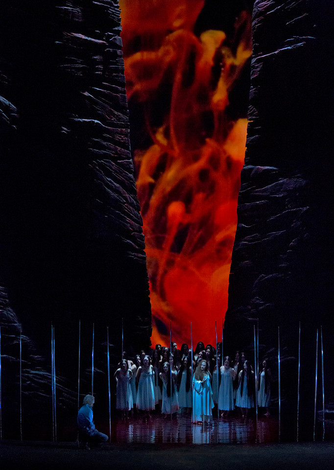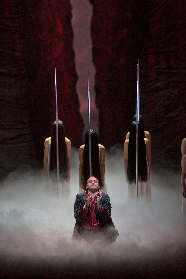 Туда, во владения Клингзора, наивный простец и держит путь во втором акте, в котором красная расселина теперь превращается в зловещее красное ущелье между двумя огромными отвесными скалами, на дне которого мы видим красное озеро (настоящий водный партер — самая необычная, но интересная «фишка» этой сценографии). На призрачной глади озера на шестах-копьях поверженных когда-то рыцарей «растут» прелестные девы-цветы, обманчивая красота и обольщение которых всё еще продолжают нести забредшим сюда путникам рабство и смерть.