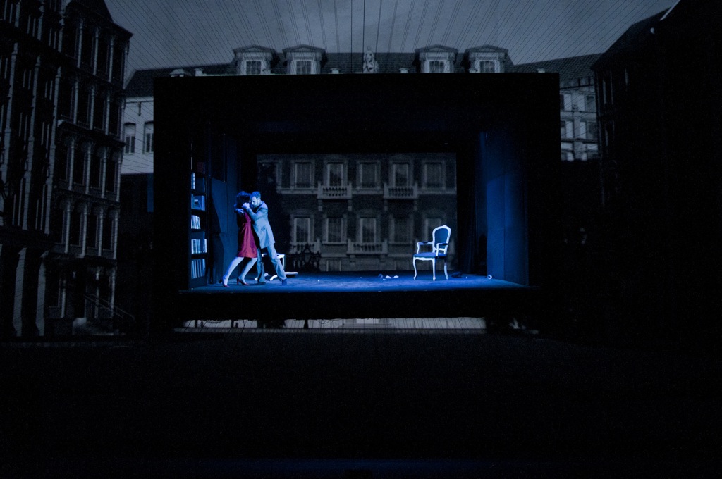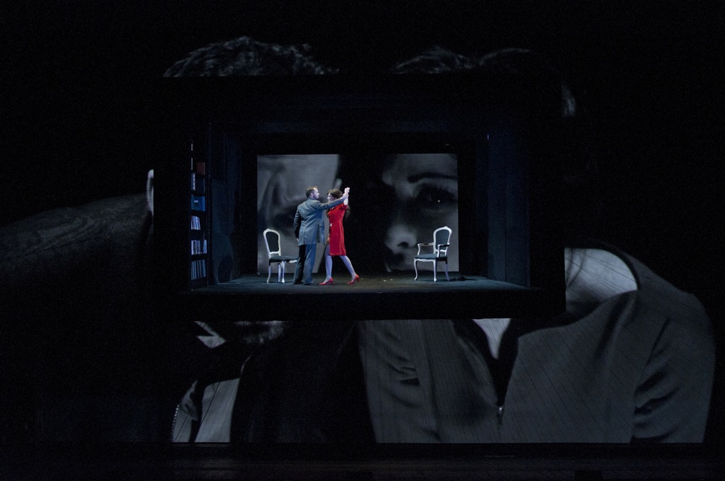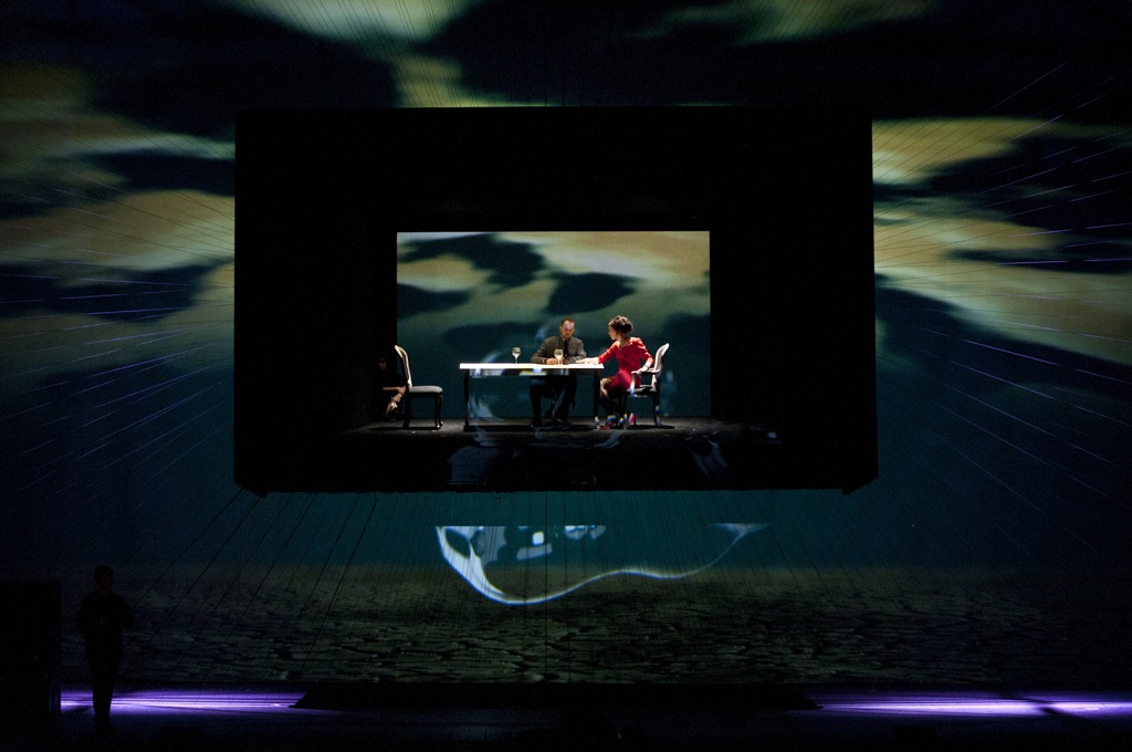 Певцы дублировались своими гигантскими двойниками, иллюзорность и зыбкость увеличивалась на порядок. Прямоугольная «коробка» с персонажами, подвешенная (!) точно в центре пространства сцены, призвана была играть роль своеобразного экспериментального стола, аквариума. И зритель, и видеодвойники рассматривали (весьма нескромно) происходящее внутри.