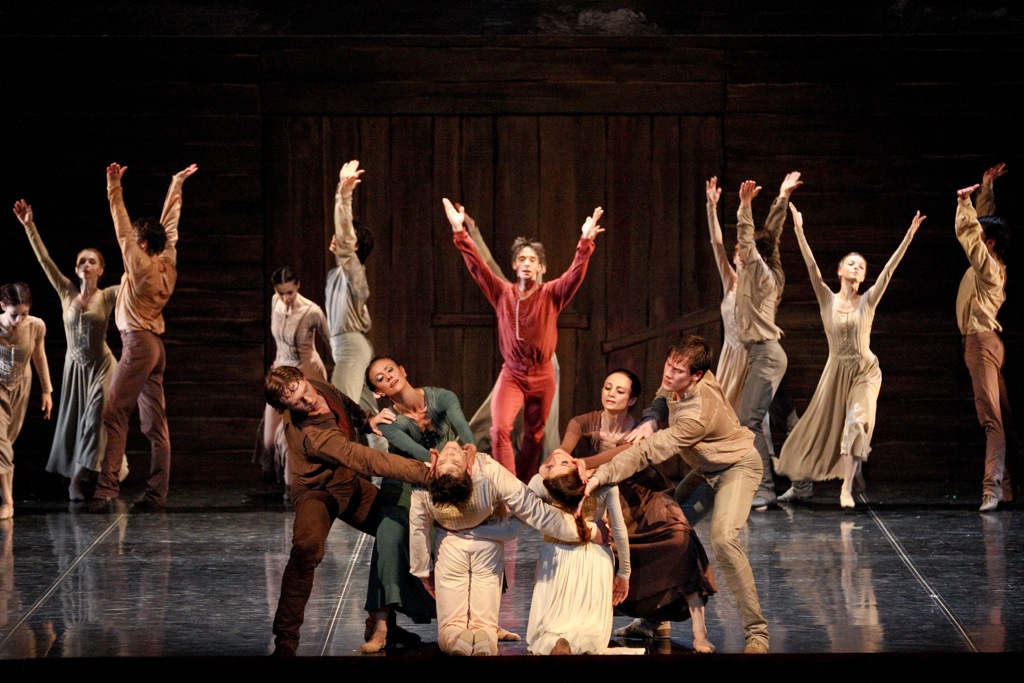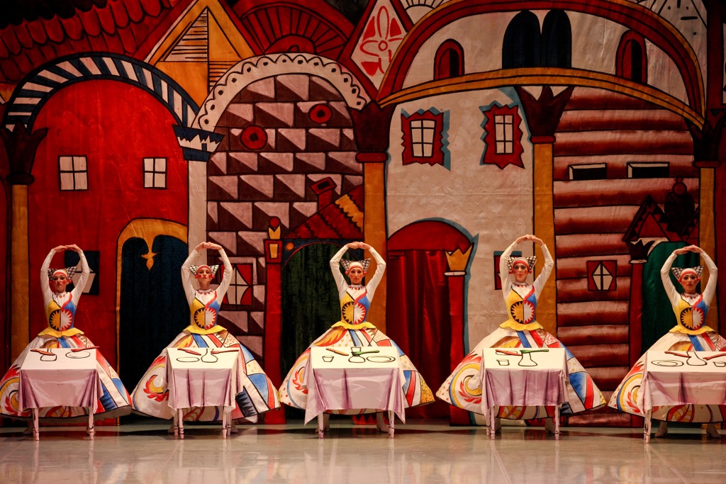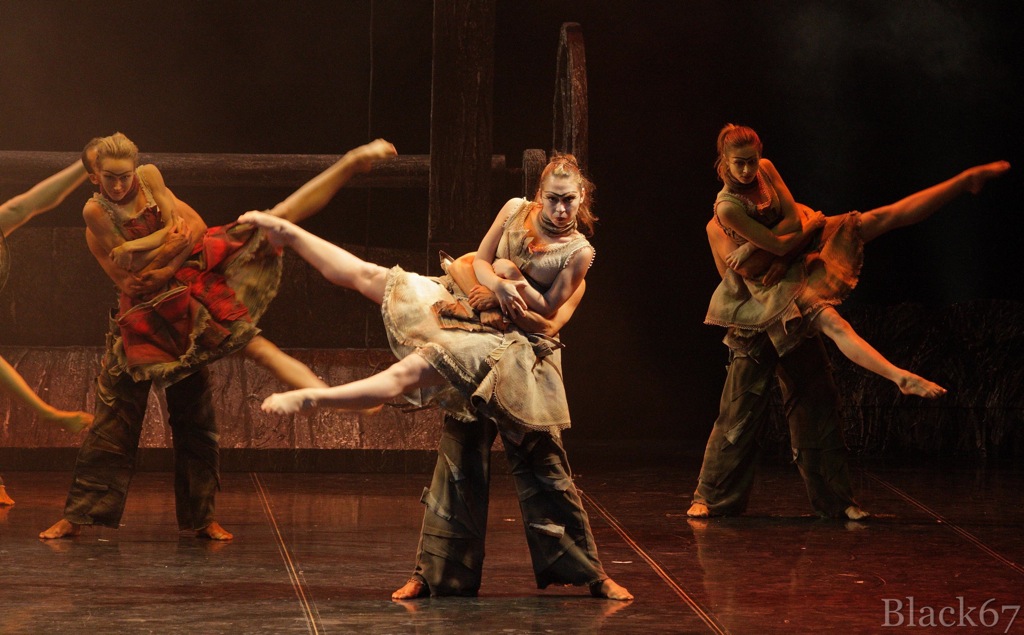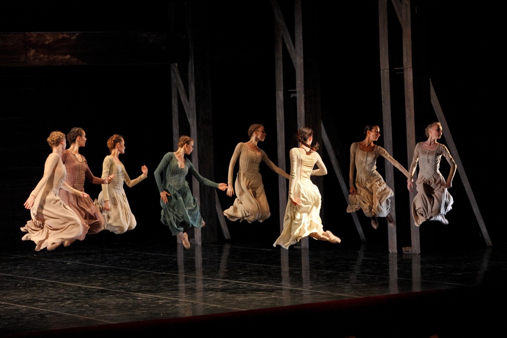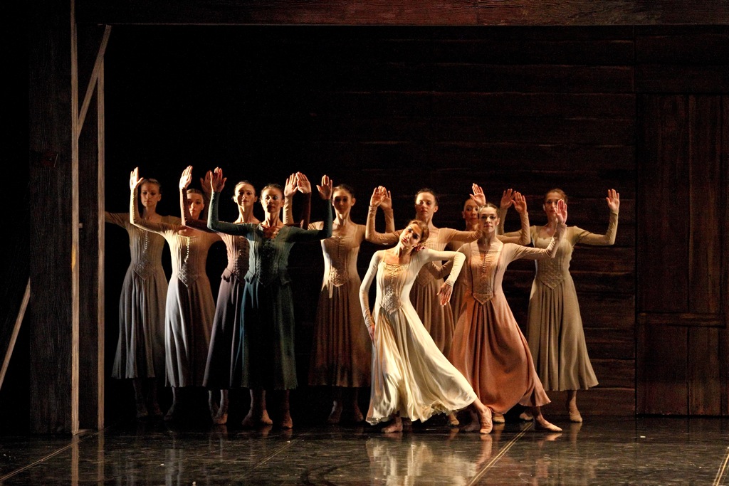 В спектакле много пластических «славянизмов» — низкие грубоватые плие, как память о русской присядке, матрёшечные повороты головы.
