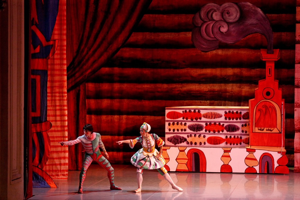 Герои (Молодой Шут, Шутиха, семеро шутов, купец, жены шутов) были «вооружены» сложной вязью па. Лучше всего Мирошниченко знает пластику Форсайта, репетитором балетов которого он несколько лет был в Мариинке — и сказочная братия, облаченная в расписные юбочки и брючки затанцевала на языке «In the Middle».