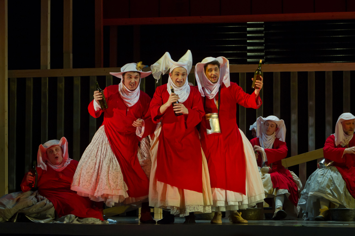 Грубые материалы — рифлёное железо, строительные леса-балки, огромные авангардные панели красного и бежевого цветов — это оформление модернового спектакля (сценограф Андрей Кондратьев). В то же время в этих авангардистских изломах причудливо угадываются башенки средневековых замков. Эта аллюзия поддерживается костюмами Ирэны Белоусовой — не дотошно историчными, но в них явственны средневековые мотивы: высокие головные белоснежные уборы дам и лжемонахинь, их красные сутаны, серебристые доспехи воинов.
