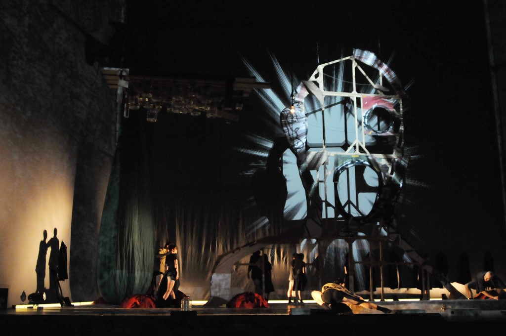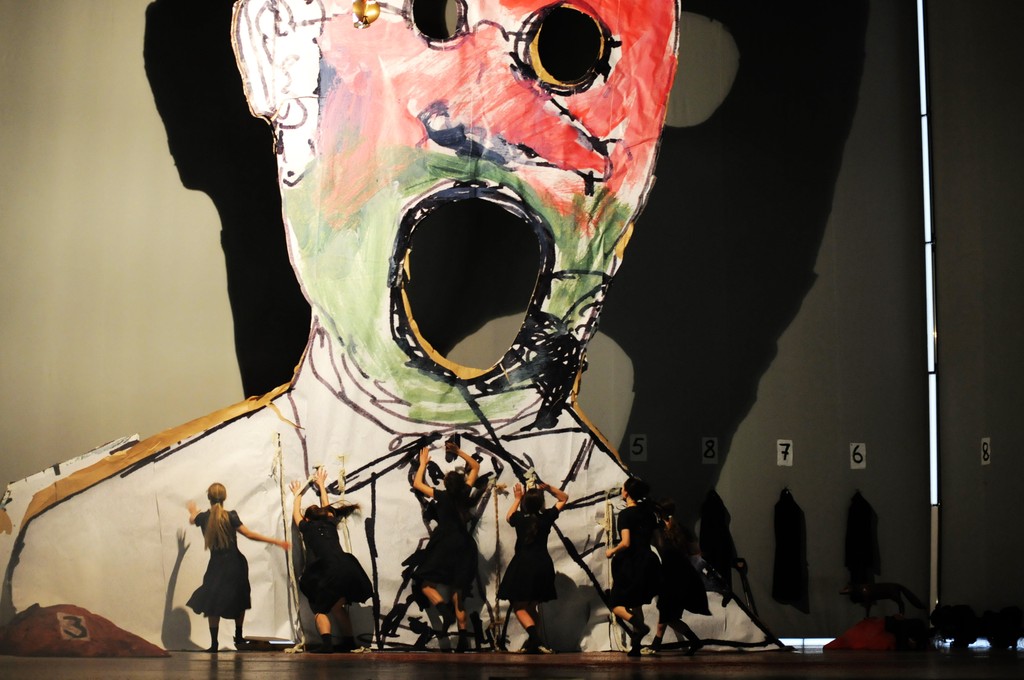 Одно из самых красивых мест спектакля — когда с колосников спускается грубо намалеванный на оберточной бумаге портрет неизвестного с открытым ртом, напоминающий перефразированный «Крик» Э. Мунка и одновременно «Папу Иннокентия X» Ф. Бэкона, а на сцене начинается бабий бунт.