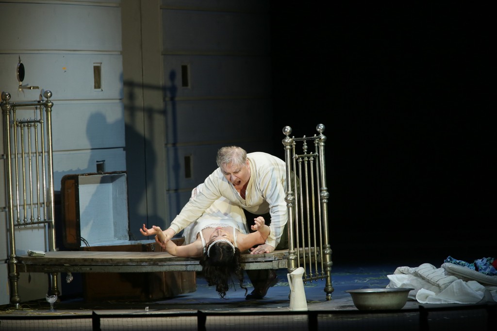 И на берег Днепра Князь не выходит. Он поет знаменитый речитатив: «Вот мельница… она уж развалилась», находясь в своей комнате, а за стеной обитает его Княгиня. Из чего, кстати, следует, что у супругов — раздельные спальни, и настоящей близости между ними нет. Измаявшись мучительным чувством вины, Князь даже пытается повеситься на брючном ремне, прицепив его к никелированной кровати: из петли его вынимает вовремя подоспевший слуга, точнее — друг-наперсник (Евгений Уланов). Безумный мельник в драном пыльнике сам заваливается к Князю, пылая жаждой мести, и поет свое знаменитое «Я продал мельницу бесам запечным».