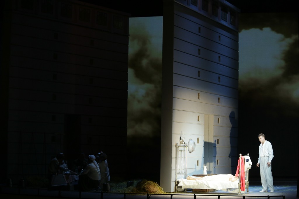 — проартикулирована Марголиным лаконично и просто. Конструкция из движущихся стен разделяет сцену на сегменты, объемы которых варьируются; когда действие переносится в господский мир, стена отодвигается влево, когда, в первом акте Князь встречается с Наташей — миру крестьян отводится больше пространства, и стена отодвигается вправо.