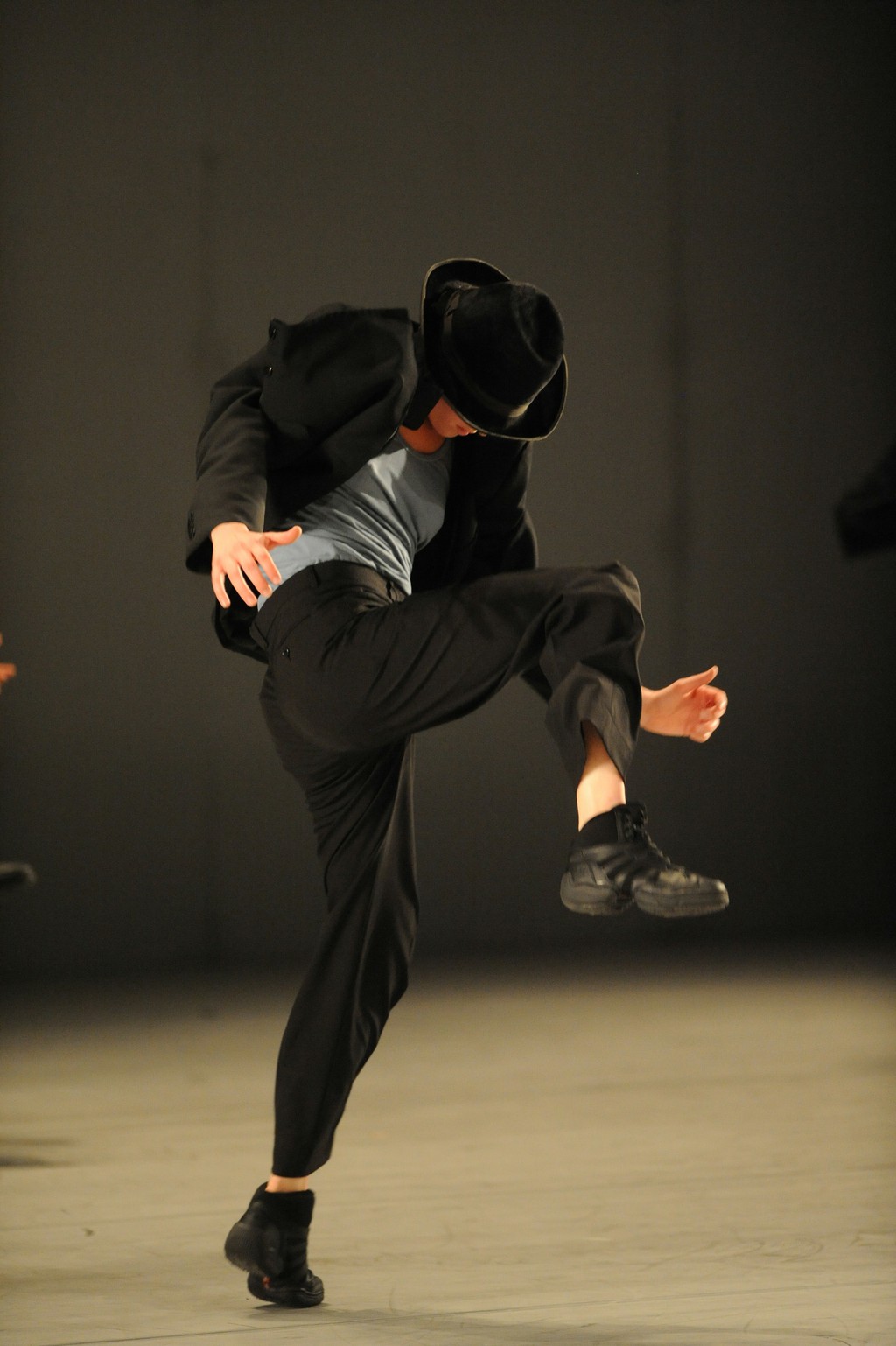 сначала в центр сцены летят пиджаки, потом — ботинки, потом — рубашки и брюки, танцовщики остаются только в нижнем белье, продолжая коллективное радение, лишь последний не принимает участие во всеобщем разоблачении.