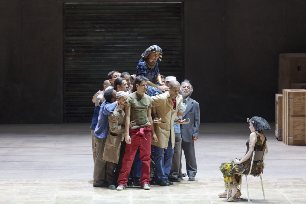Затем в сцене где Птолемей (Толомео) прислал Корнелии и Сексту (жене и сыну Помпея) отрубленную голову Помпея, рабочие вытаскивают на сцену огромную голову, отвалившуюся от гигантской статуи. Оплакивания семьёй этой головы и создаёт это двойное измерение, пронизывающее весь спектакль: дела давно минувших дней, преданье стороны глубокой, на самом деле очень близкое и понятное современному человеку. Ведь со времён древних греков и египтян, ничего в человеческих страстях не изменилось.