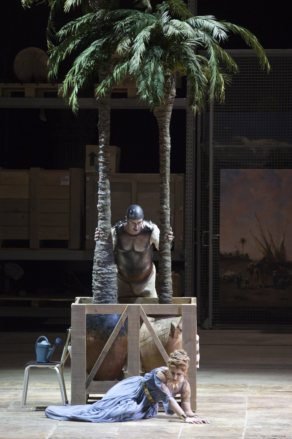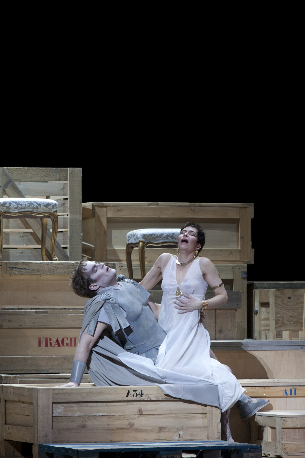 Клеопатра режиссёра Лорана Пелли и сопрано Сандрин Пио не скрывает того, что в поисках покровительства в деле отымания власти и трона у своего брата, она поначалу зацепляет римского императора исключительно по принципу «где у вас тут тот мужик, который решает этот вопрос?» и применяет весь свой женско-эротический арсенал средств воздействия (включая обнажение, приближение, прикосновения), но как-то у неё всё так красиво, тонко, изящно и естественно получается, что к грани вульгарности она даже не приближается.