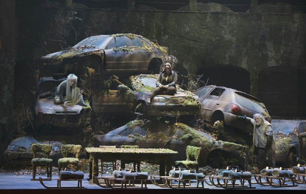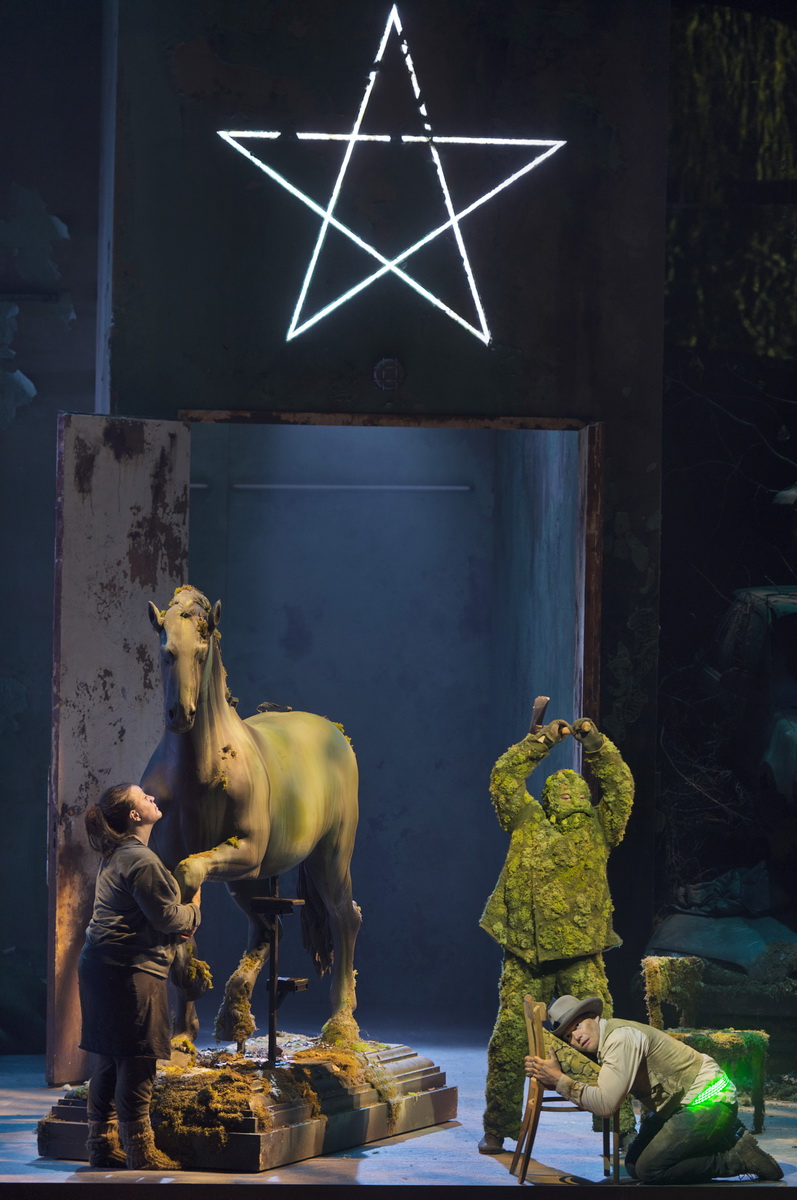 Если не знать легенды, на сцене трудно что-либо понять. Но можно прочитать либретто. Между тем, режиссеру мало сложностей восприятия саги. Рыцаря Гавейна он ассоциировал с Йозефом Бойсом, немецким художником-инсталлятором и борцом за экологию. Очевидно, сработали ассоциации со словом «зелёный».