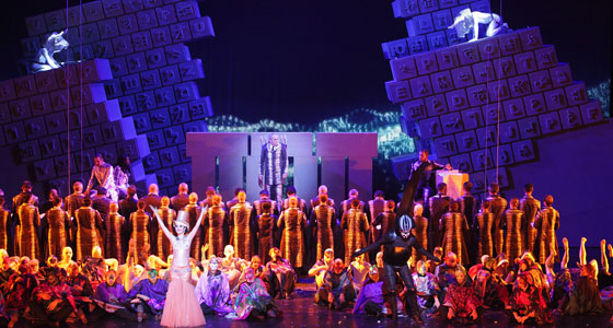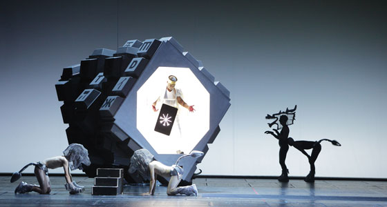 Вавилонская башня состоит из гипер-клавиш компьютера с разными шрифтами (шумерским, аккадским, латинским). Пресловутая вавилонская мифологема confusio linguarum (с лат. — языковая путаница) трансформируется в спектакле в символ интернационального сообщества, а Вавилон становится метафорой культурно-религиозной гетерогенности и мировой глобализации.