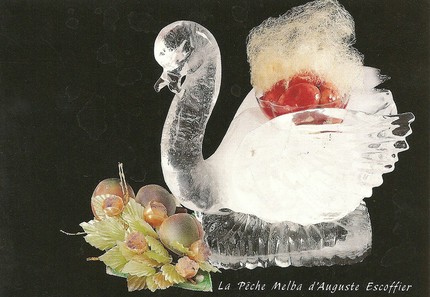«Размышляя о величественном мифическом лебеде, который появляется в первом акте «Лоэнгрина», я в нужный момент приказал подать ей персики на «ложе» из ванильного мороженого, в серебряном кубке меж крыльев изумительного лебедя, высеченного из льда и посыпанного сахарной пудрой. Эффект был удивительный и госпожа Мельба была крайне поражена оказанным ей вниманием. Впоследствии я встретил ее в отеле Ритц в Париже, и она напомнила мне о вечере, когда ей подали знаменитые "персики в лебеде"»,— так описал создание нового десерта сам Эскоффье.