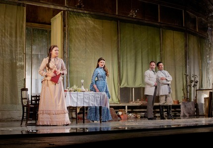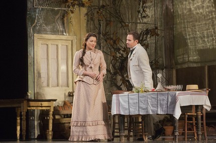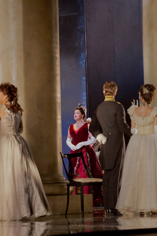 несмотря даже на то, что в деревенских сценах ее облик нарочито ассоциируется с лишенным всяческой романтики типажом кустодиевской «мадонны», сидящей у самовара за чашкой чая. И лишь в сцене петербургского бала и, в особенности, в заключительном дуэте с Онегиным Анна Нетребко, наконец, преображается в эффектную гранд-даму.