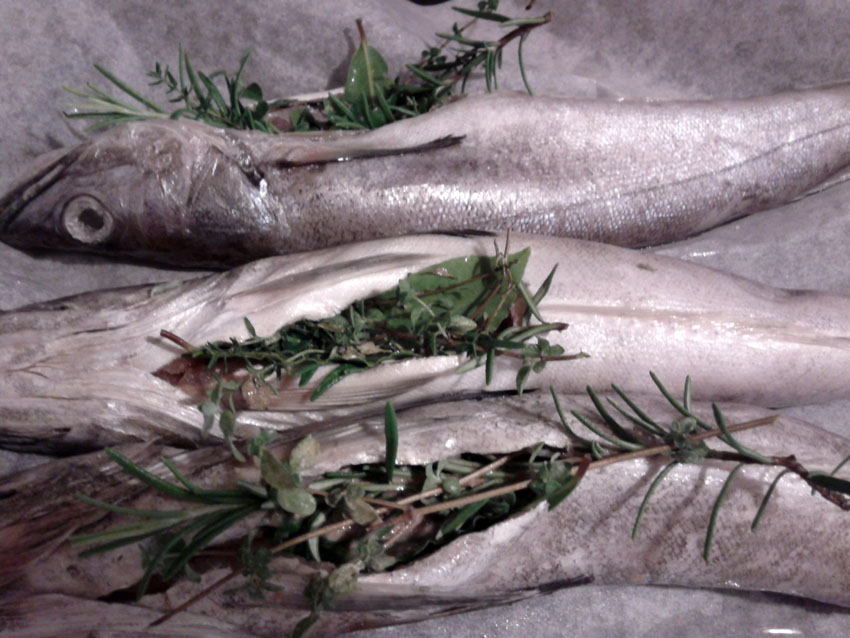 Рыбу почистить, освободить от внутренностей, вымыть, обсушить, посолить и поперчить. Внутреннюю часть тушки ароматизировать смесью из трав, солью и перцем. В сковороде обжарить в жире или оливковом масле анчоусы и тертые сухари. Полученная смесь должна иметь консистенцию крема. Этой смесью начинить рыбу внутри и покрыть снаружи. Щедро посыпать рыбу тертыми сухарями и смесью из ароматных трав. Запекать в духовке с картофелем.