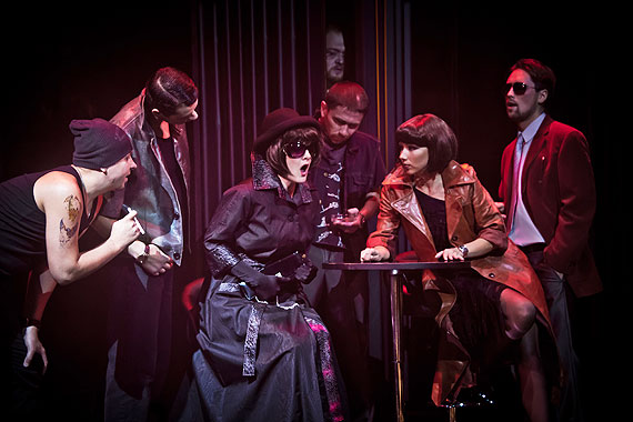 Сцену от публики отгораживает ярко красный занавес, на котором изображен зал одного из красивейших оперных театров мира — какого даже не столь важно. Программка утверждает, что это вид Королевской оперы в Стокгольме, но здорово смахивает и на парижскую «Гранд-опера» и ещё на десяток приторно оформленных пространств времен расцвета оперного жанра. Это единственно запоминающаяся картинка за весь спектакль: