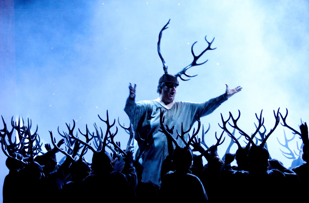 Сама же финальная картина полуночного розыгрыша и наказания Фальстафа у дуба Герна, несмотря на полную в данном случае абстрактность сценографии, решена не столько комедийно и не столько в романтическом ключе, сколько в рационально-реалистичном ракурсе. Никакого таинства ожидания финальной развязки не происходит: режиссер просто методично всё раскладывает по полочкам, не забывая проучить Фальстафа, а заодно под шумок обвенчать Наннетту и Фентона, создав и разрешив, помимо ситуации с ревностью Форда, еще одну комедийную ситуацию.
