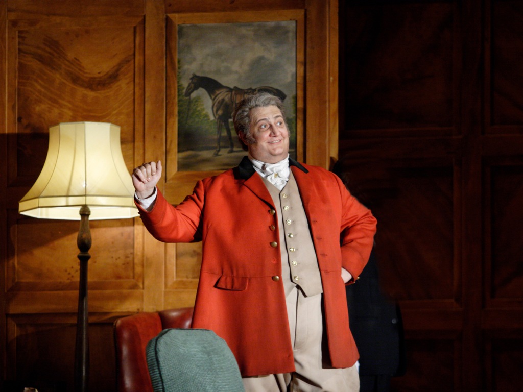 На сцене есть даже настоящая лошадь, мирно стоящая в стойле и спокойно уплетающая свой корм, но видавшую виды Миссис Квикли эти пустяки, похоже, нисколько не смущают. Ее второй визит к Фальстафу кажется даже более деликатным, а от того – еще более комичным.