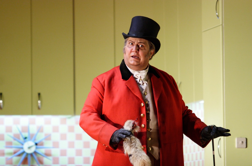Финал этого акта хрестоматийно известен: Фальстаф, дабы не попасться в руки всё принимающего за чистую монету и вовремя подоспевшего Форда, оказывается в корзине для грязного белья, сброшенной в Темзу. Но неожиданную пикантность этой картине придает то, что она разворачивается в интерьере современно обставленной кухни – явной мечты всех домохозяек послевоенного времени. И эта кульминационная картина постановки, решенная в стиле современной комедии dell’arte, удается режиссеру, пожалуй, больше всего. При этом первая картина следующего (третьего) акта никаких иллюзий на респектабельность сэра Джона Фальстафа, уже не оставляет и вовсе.