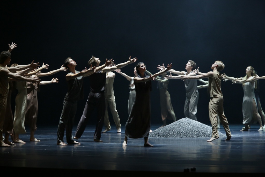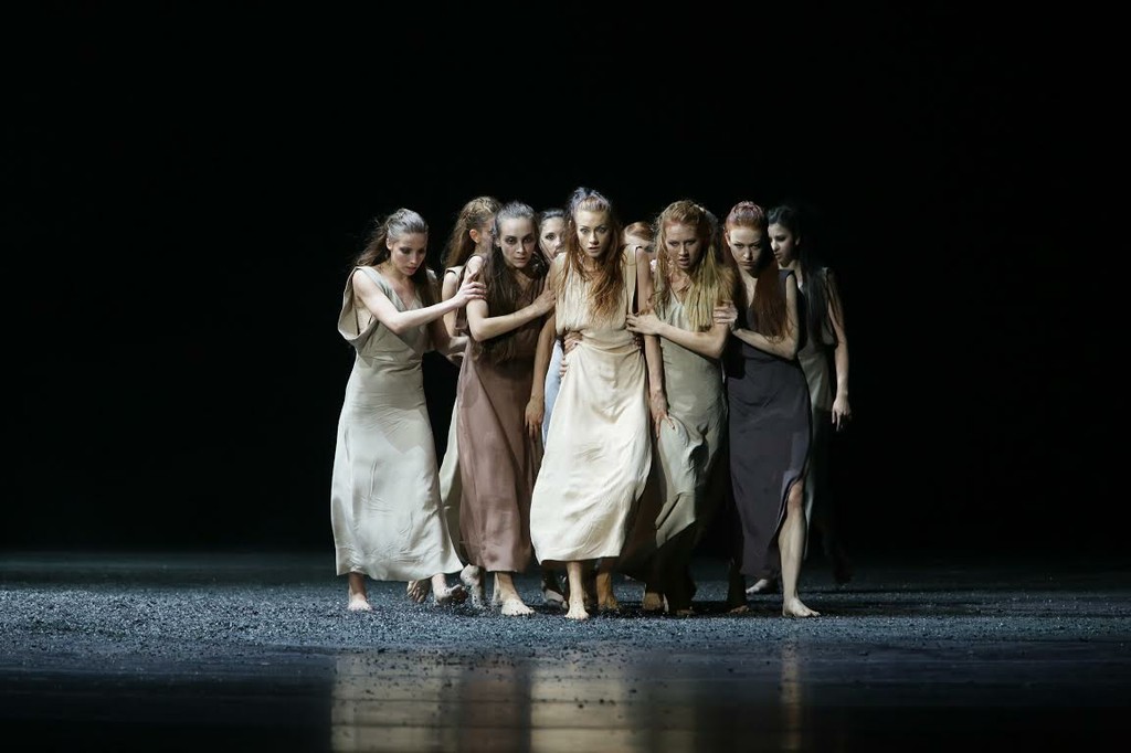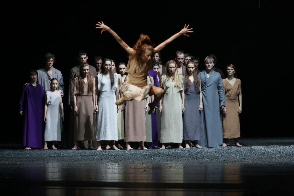 Начинается балет с того, как невыразительный луч света падает на кучку блестящего пепла. По сцене разбросаны фигурки людей, облаченных в длинные античные одеяния — пеплосы-туники-тоги, сшитые из грубой серо-бежевой ткани. Кажется, что сейчас начнутся какие-нибудь старомодные «Хоэфоры» или «Эвмениды» Петера Штайна.