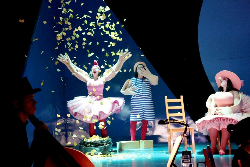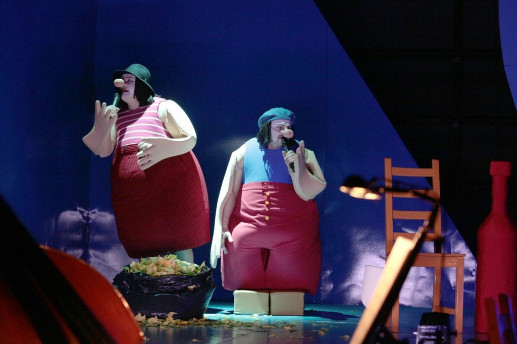 в которой наряду со знаменательными частями речи присутствовало целое море междометий и спецэффектов звуковой реверберации. Вступая в сценический разговор, актеры в гипертрофированно-уродливых ватных костюмах-«домиках» и накладном макияже, превращающем их в мимов и скрывающем выражения лиц, демонстративно доставали откуда-то микрофоны и резвились с ними на полную катушку. Очевидно, это было для них гораздо интереснее и «прикольнее», чем исполнять арии, то есть музицировать вживую, без микрофона.