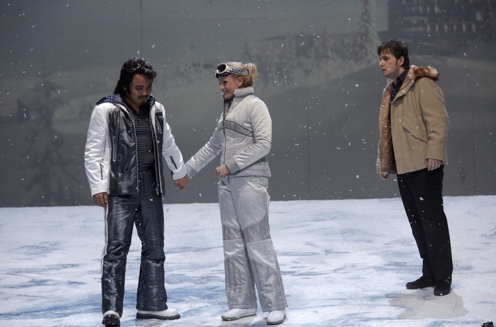При помощи подрядчика и потенциального зятя Ленского она начинает генеральный ремонт своих владений. К именинам Татьяны приурочено празднование открытия обновлённых апартаментов, с террасами и бассейном. В третьем акте мы оказывается на фешенебельном горнолыжном курорте. Это уже совершенно другой мир, другая планета, и горнолыжные костюмы напоминают скафандры.