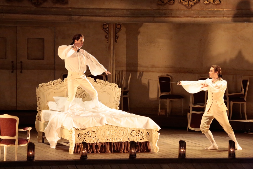 в умении раскрепостить ещё совсем неопытных артистов, создать команду, для большинства из этих певцов данная премьера — первая крупная партия вообще или на сцене Большого театра. Незаметно было, что второму составу досталось меньше сценических репетиций, настолько ловко все бегают, падают, бьются на шпагах. Дружеская дуэль Гульельмо и Феррандо в начале оперы во время пения дуэта — комплимент мастеру боевых искусств Олегу Найдёнышеву, поставившему фехтование.