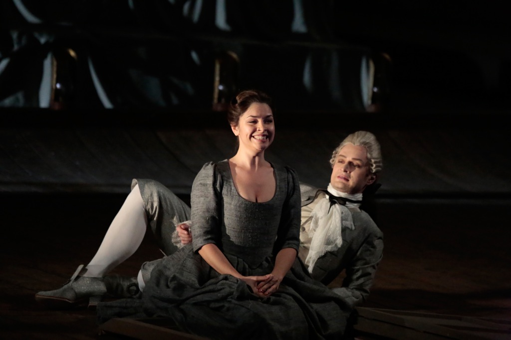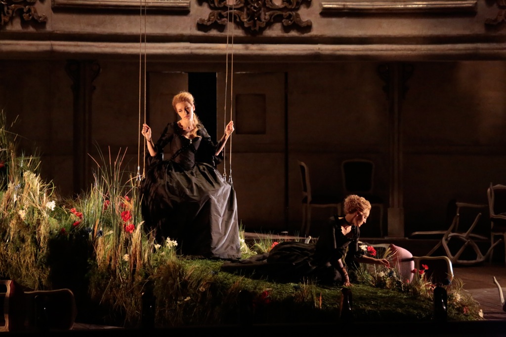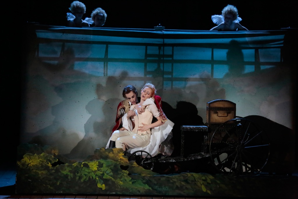 Этот старинный зал в декорации удивительно настоящий, даже цвет ярусов винтажно-алебастровый, как из дорогого камня, хорошо поддающийся игре света (художник по свету Алекс Брок). Сценограф Гидеон Дэйви постоянно играет театральным пространством. То герои выясняют отношения перед «пожарным» занавесом, и мы видим фанерную изнанку кулис, то рисованные райские кущи скрывают кресла и ложи, выпархивают очаровательные дети-амурчики, иллюзия барочного представления давних времён становится полной.