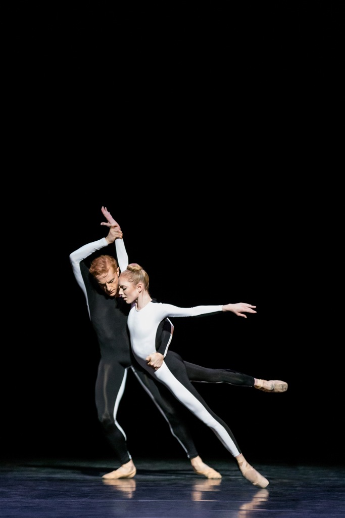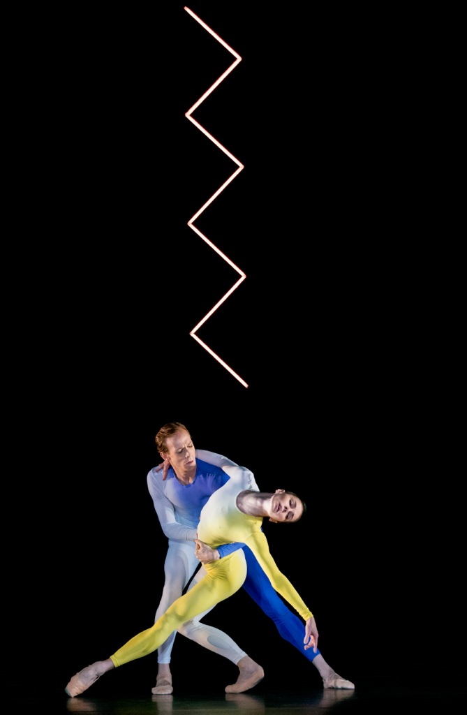 Дизайнерские находки актуальной художницы Таубы Ауэрбах в области балетного костюма рассчитаны на пары и они начинают работать в движении. Задник темный как ночное небо, но вместо звезд на нем «висит» разная светящаяся геометрия. Черно-белые как клавиши рояля Сара Лэмб и Стивен МакРей, сине-желтые как молния Наталья Осипова и Эдвард Уотсон. В балете заняты почти все примы и премьеры труппы.