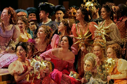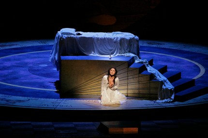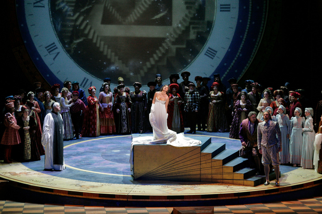 Фламандский режиссер Ги Йостен предстал вполне здравомыслящим проводником, скорее, трагедии Шекспира, а не той особо возвышенной французской музыкальной производной от нее, которая и называется оперой Гуно «Ромео и Джульетта». Режиссер весьма, искусно манипулируя между абстрактным, но, тем не менее, театрально зрелищным «космическим» визуальным рядом, созданным сценографией Йоханнеса Лайакера и светом Дэвида Каннингема, с одной стороны, и пышно-традиционным многоцветным пиршеством «исторических» костюмов Хорхе Хары, с другой, историю о Ромео и Джульетте рассматривает, словно малую планету любви, затерявшуюся во вселенной. То, что эта планета действительно затерялась в безбрежном мироздании музыкального театра, сомнений не вызывает, ведь «эклиптика» постановки – круглый концентрический подиум с зодиакальной картой звездного неба, на котором всё и происходит.
