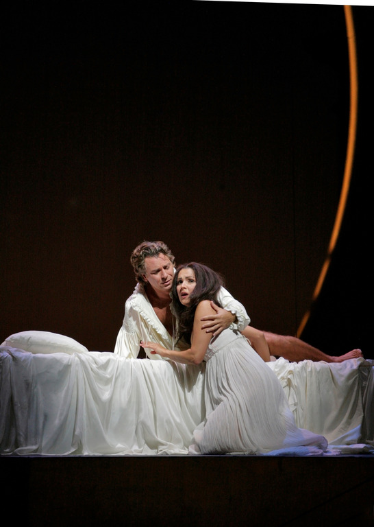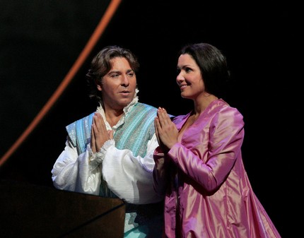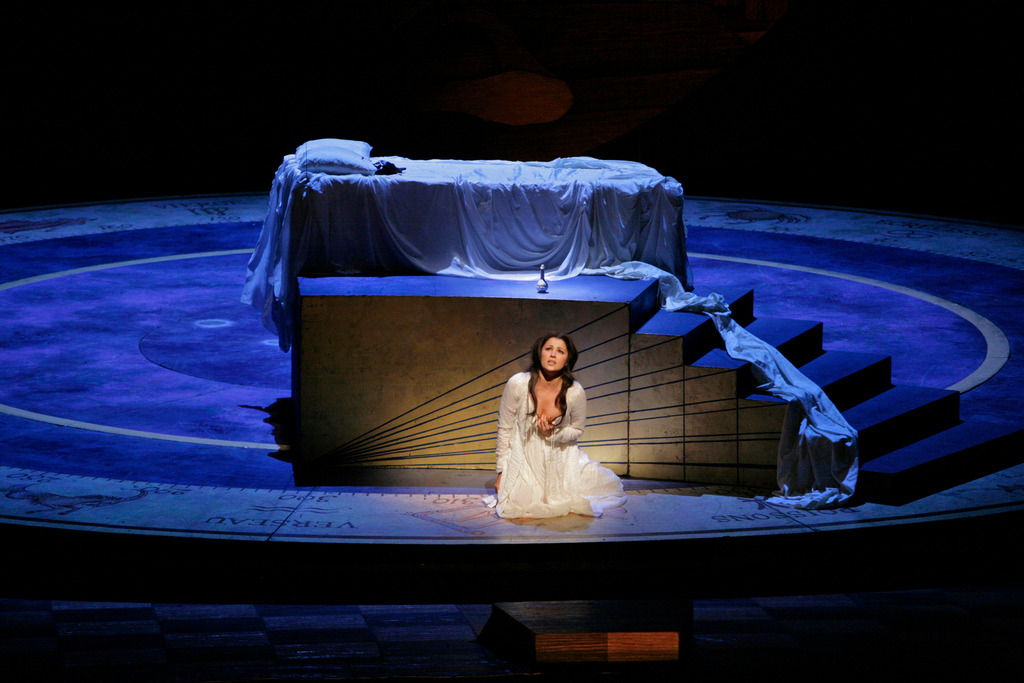 Роберто Аланья, несмотря на то, что вокальная составляющая его образа временами явственно недобирает в музыкальности, выглядит просто прирожденным Ромео – изысканно утонченным и романтически страстным. Он и впрямь всё еще хорош собой, и почти балетное обтягивающее трико с современными ботиночками на каблучке при вполне традиционном верхе – расшитом камзоле – явно намеренно призвано подчеркнуть его сексуальность. Но голос певца, перейдя на том этапе его карьеры из категории изысканно лирических в категорию ярко выраженных лирико-драматических, уже не столь послушен и пластически податлив, а кантилена уже не столь изящна, как в былые памятные времена. При этом Джульетта в исполнении Анны Нетребко с момента своего первого появления на сцене и до момента финальной трагедии предстает особой далеко не романтической, а какой-то «плотоядной хищницей», нимфоманкой. И это постоянно подчеркивается безыскусно грубой, абсолютно неубедительной драматической игрой, агрессивно открытой певческой эмиссией, типично русскими «вокальными накатами» и поразительно неровным звуковедением, при котором окончания музыкальных фраз, что вообще очень характерно для того периода творчества певицы, оказываются брошенными, непропетыми, практически редуцированными.