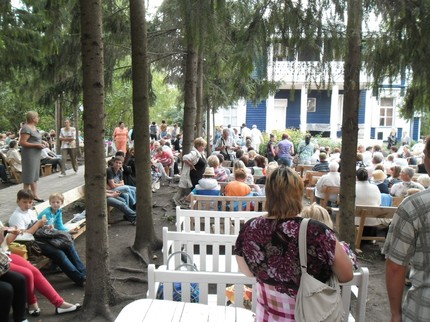 Постепенно публика собиралась на поляне перед верандой, и в результате народу набралось так много, что не хватило скамеек, в значительном количестве заготовленных для подобных случаев, и многие слушатели были вынуждены слушать концерт стоя или располагаться на крыльце противоположного дома, а также сидеть на всём, на чём можно было умоститься:
