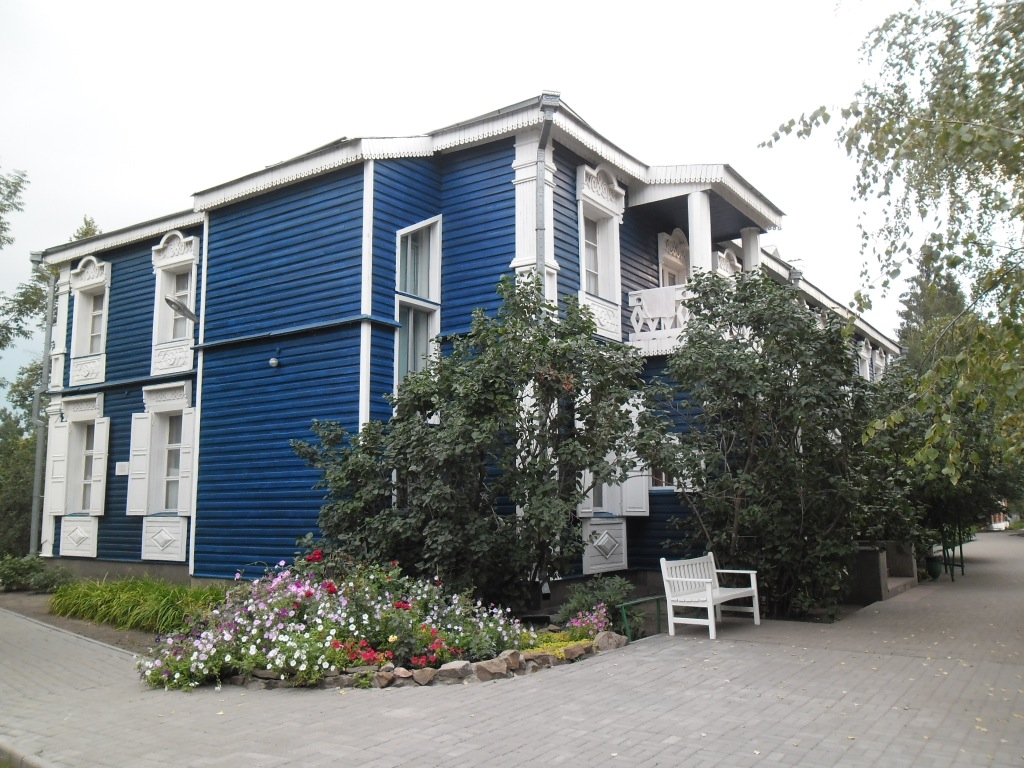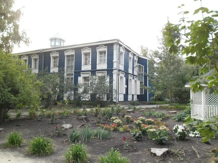 Пройдя по аллее, я обнаружил утопающий в зелени и цветах воссозданный в 1995 году усадебный дом сине-белой раскраски: