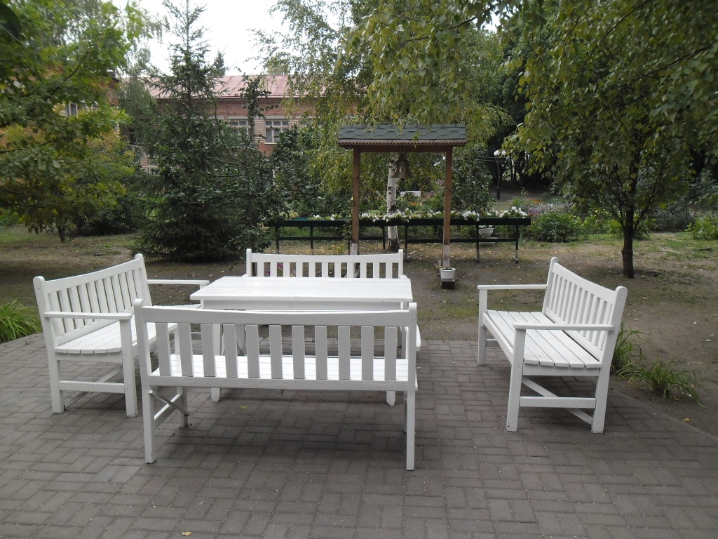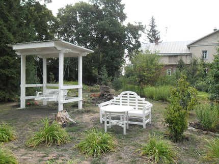 Такой же белой расцветки мебель, беседки, скамейки щедро расставлены по всей усадьбе, а рядом с усадебным домом на перекладине подвешен колокол: