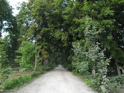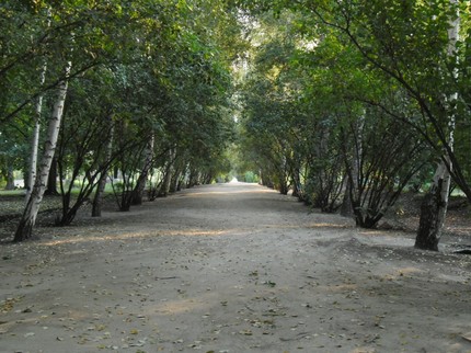 С запада на восток всю усадьбу пересекает длинная берёзовая аллея, выложенная песком и отмеченная по краям высаженными в ряд деревьями, как это было при Рахманинове: