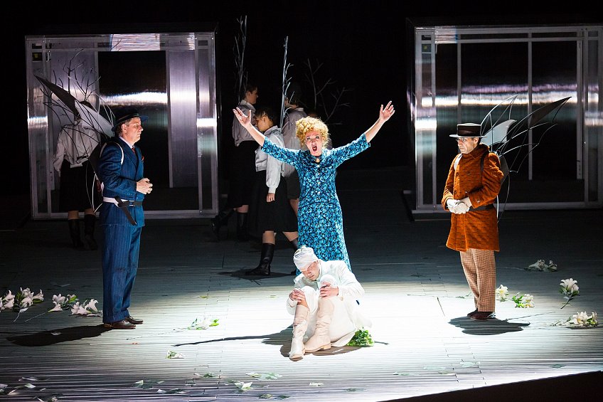 Так бывает с произведениями искусства, в которые авторы впихивают слишком много букв. Даже при беглом взгляде видно, что постановка Вэйро затрагивает не только социально-психологическую проблематику как драматургическую основу оперы Моцарта, но и активно высказывается на антивоенную тему, поднимает философские вопросы, связанные с завершением жизни на пике эмоционального просветления, пытается апеллировать к фатумно-кармическим категориям и вообще нашинковывает музыкальный текст Моцарта на символические озарения на тему о том, «как можно услышать это произведение».