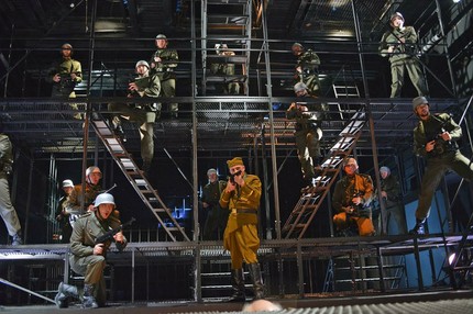Однако то, что мы видели при этом, уже нельзя охарактеризовать так однозначно положительно — постановочная команда (режиссер-постановщик Михаил Кисляров, дирижер и хормейстер Алексей Верещагин, художник-постановщик Виктор Вольский, художник по костюмам Ольга Ошкало, художник по свету Владимир Ивакин и другие) реализовала работу, без сомнения, грандиозную, но очень уж небесспорную по своему существу.