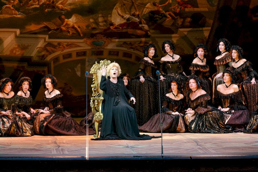 Ее выход на сцену с песней Марфы после приветственного хора из второго действия «Пиковой дамы» оказался настолько эффектным, что сразу же не замедлил вызвать горячий прием зрительного зала. В этой опере Чайковского мы всегда ждем появления на балу императрицы – Екатерины Второй. На сей же раз на «Оперный бал» мы пришли ради Царицы Оперы, и на этом тема «Пиковой дамы» исчерпана еще не была: ближе к финалу первой части вечера мы услышали певицу в партии Графини (сцена в спальне). За долгие годы карьеры воплощение певицей образа «демонической старухи» в этой опере успело стать эталонным, незабываемым, детально проработанным в своей вокальной, актерской и психологической первозданности.
